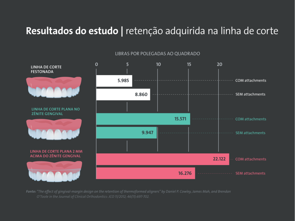 Os alinhadores ClearCorrect apresenta uma linha de terminação lisa e não recortada que se prolonga para além da margem gengival. A s pesquisas indicam que os alinhadores com esta técnica aplicada na linha de terminação têm maior força de retenção que os alinhadores recortados , o que pode reduzir a necessidade de attachments. Com menos attachments, os alinhadores encaixam-se nos dentes de forma mais justa, o que representa uma melhoria estética que se traduz em pacientes mais felizes.